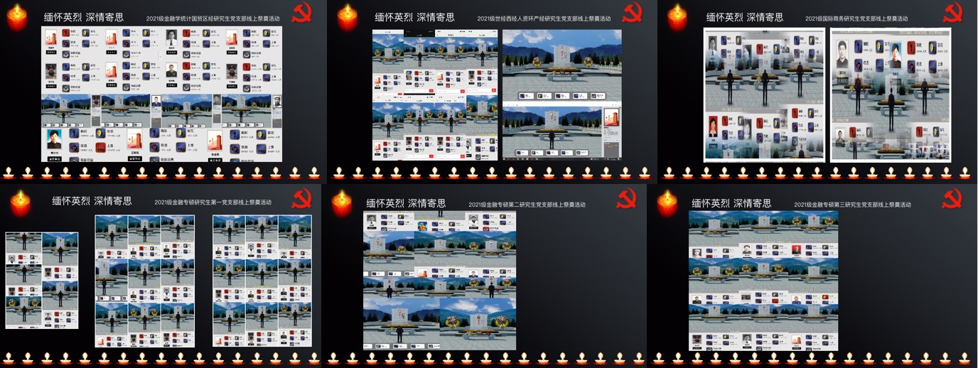 “天地英雄气,千秋尚凛然”英雄先烈是我们民族的脊梁。当前,上海正处于疫情防控的最关键阶段,为缅怀英烈,传承革命精神,402永利集团研究生党建中心组织研究生党员开展线上祭扫活动,遥寄追思情,文明祭扫行。2022年4月5日,2021级金融学统计国贸区经研究生党支部、2021级世经西经人资环产经研究生党支部、2021级金融专硕研究生第一党支部、2021级金融专硕研究生第一党支部、2021级金融专硕研究生第三党支部、2021级国际商务研究生党支部共85名党员通过登陆中华英烈网开展此次线上清明节祭英烈、致哀思活动。 活动中,研究生各党支部书记带领研究生党员通过登录中华英烈网“2022奋进网上祭英烈”活动专栏,浏览页面中的烈士墓址,在“云端”为英烈敬献花篮、敬酒、祭拜并用心写下寄语。全体党员同志起立,面对中华英烈网上烈士遗容鞠躬默哀,追忆缅怀英烈。