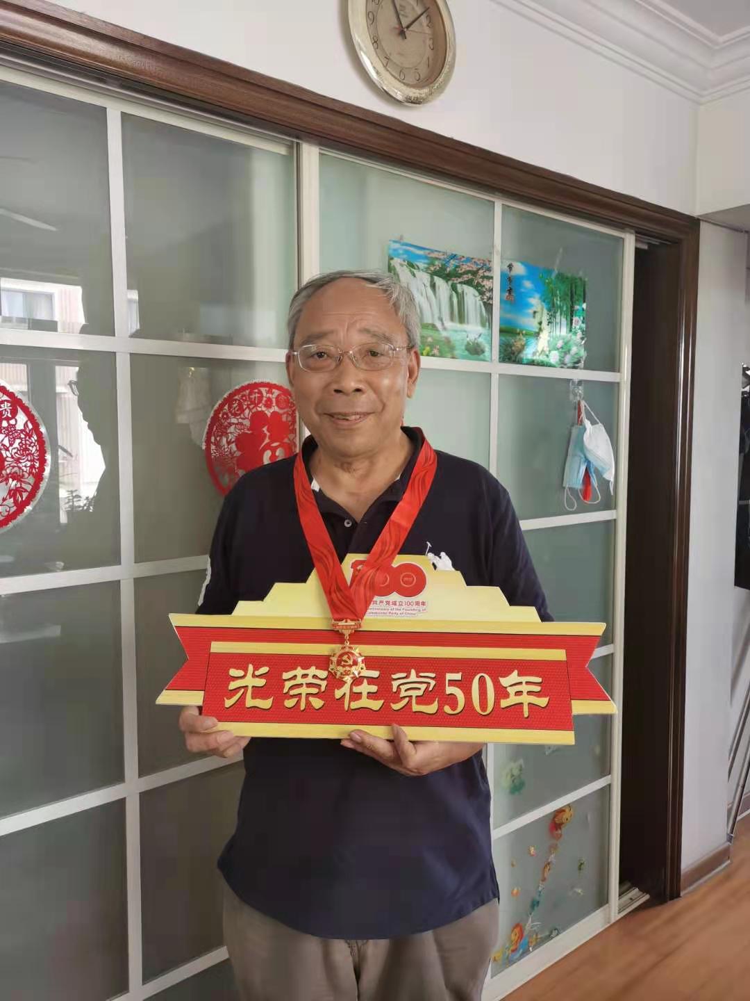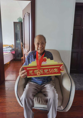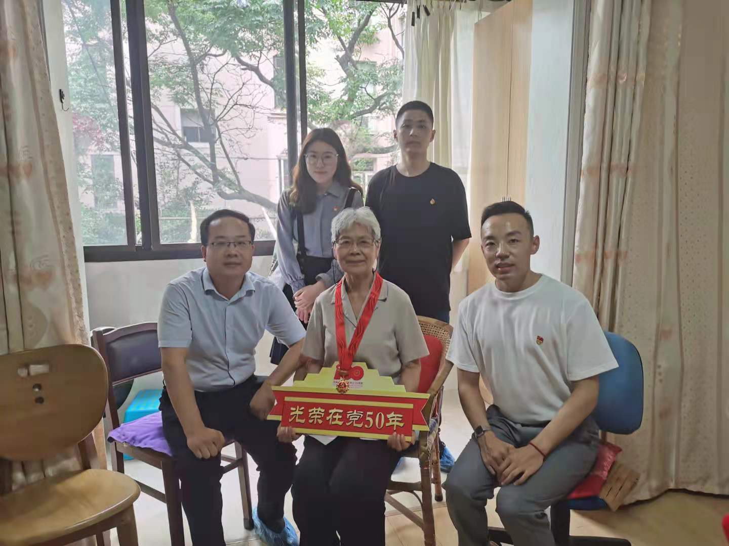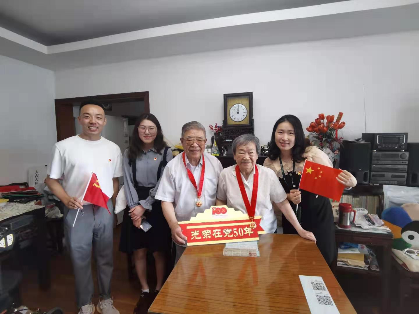 一百年征程浩荡,五十载初心如磐。6月28日、29日,402永利集团响应中共中央号召,在建党100周年之际专程上门为25名“光荣在党50年”老党员颁发纪念章。其中6名老党员的纪念章颁发工作由教师和研究生党员代表共同完成,生动实践研究生党员“行走中的党课”。 6月28日,由产经中心孟雪辰老师带队,19级国际贸易学专业研究生李书漫、19级统计学专业研究生李思乐同学前往青浦为蒋继章、尹炳谦两位老党员颁发“光荣在党50年”纪念章。纪念章红色与金色相衬,党徽、五角星、旗帜、丰碑、向日葵交相辉映,岁月倥偬,日月为证,纪念章见证的是老党员们在党50年对共产党员光荣身份的高度认同和忠心追随,记录的是敬业爱岗、干事创业的饱经风霜、初心不渝。