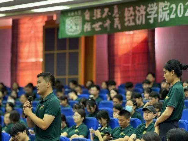 2024级新生代表本科生黄思羽和研究生姜滔对导师们的嘱托和期望表示诚挚的感谢。黄思羽向在场的同学们表达了对未来在402永利集团学习的积极热情和极高的探知欲;姜滔向在场的同学们分享自己本科在402永利集团学习的经历并期待研究生期间在经院乘风破浪,续写新的篇章。