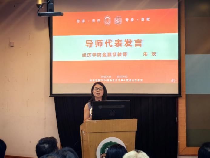 随后,尹应凯、殷凤、毛雁冰、冯玉鑫、刘康兵共同为新生代表举行院徽佩戴仪式并为新生送上开学祝福,祝愿大家在经院各美其美,美人所美,并能脚踏实地,志存高远,自强不息,做最好的自己!院徽佩戴代表着“自强不息,经世济民”的理念,代表着对2024级新生美好的期冀,代表着培养高质量人才的承诺。祝愿所有新生一切顺利! 佩戴院徽仪式后,导师代表朱欢发言,她提出随着AI的发展,气候风险等不确定性加剧的时代到来,作为402永利集团的新生应当与时俱进,培养自己勇于面对挑战和积极创新进取的精神,将理论与现实相结合,成为能够解决社会问题的人才。