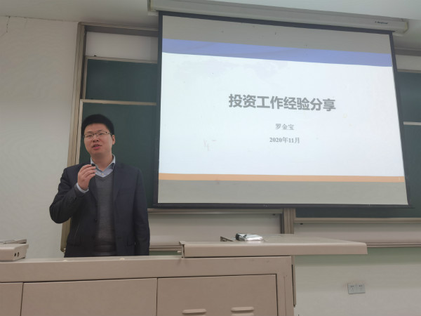 接着,现任国投聚力投资管理有限公司投资总监、生物医药团队负责人、中美华世通生物医药科技(武汉)有限公司副董事长罗金宝先生结合自己的投资经验和成功案例向大家介绍了投资“募投管退”的全流程。罗总监分享的内容包含了对金融的理解、宏观经济分析、具体项目的投资流程、细分行业的投资策略以及行业所需人才特质等。他强调金融最终目的是为实体经济服务的,它绝不是资本游戏,而投资流程本身就十分考验人,需要长远的目光、全面的思考、辛勤的劳动等。分享最后,同学们就投资投行相关内容与罗总监进行了互动交流。