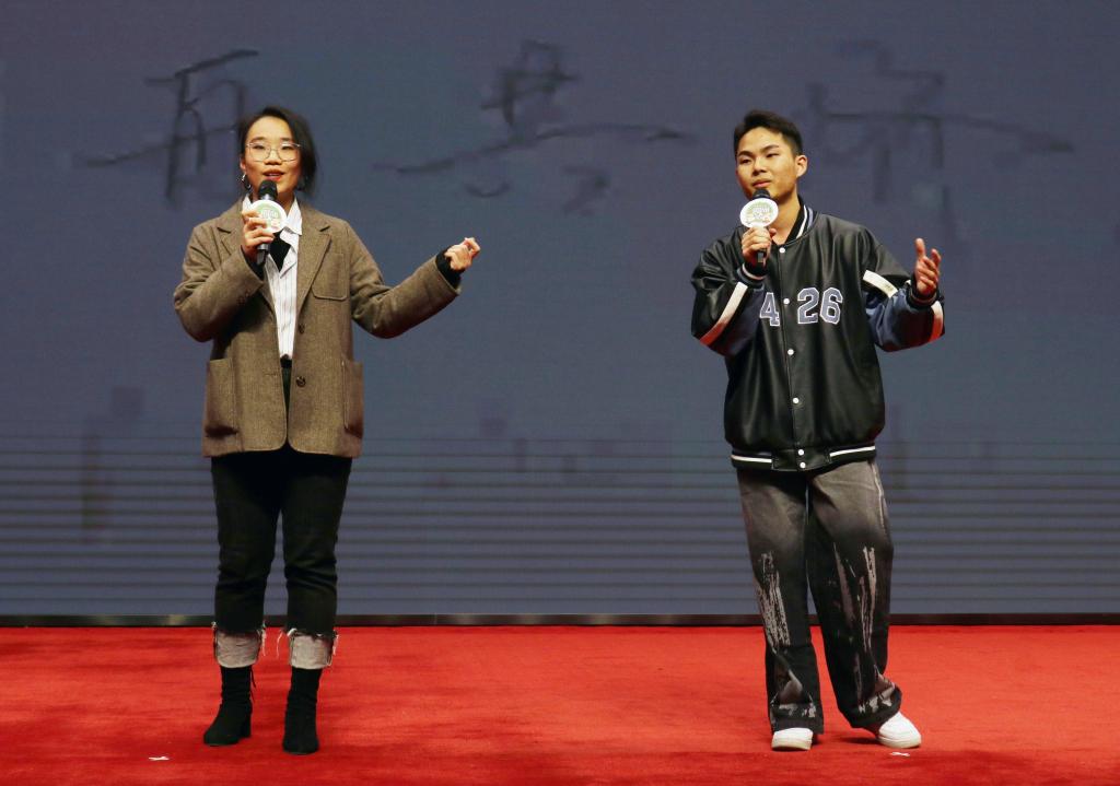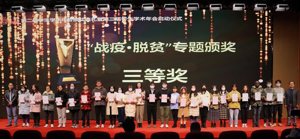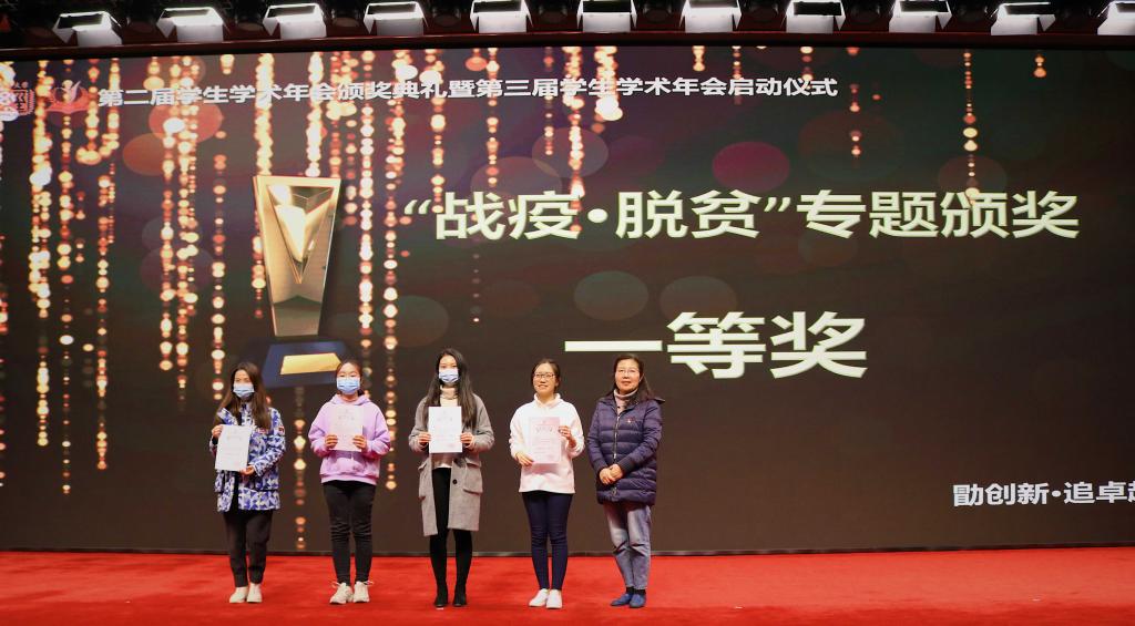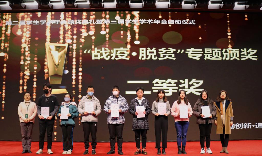 图为刘彦杉和何志聪演唱原创战疫歌曲《家·城·国》 随后,“战疫·脱贫”专题颁奖在激动人心的歌声过后拉开序幕。孙蕊、陆甦颖、韩晶、冯玉鑫、倪中新分别为在“战疫·脱贫”征文中获奖的同学们颁奖,并且勉励他们在今后的学习生活中,能够再接再厉,朝着更高的学术目标努力奋斗。