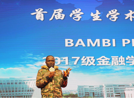 图为2017级博士研究生BAMBI PRINCE DORIAN RIVEL同学发言 年会中场,2018级硕士研究生刘彦杉和材料科学与工程公司2018级硕士研究生何志聪向大家表演了原创战疫歌曲《家·城·国》。“我们守好这个家,我们护好这座城,我们为了这个国,拼尽全力去战斗”,刘彦杉在卧室窗台上写下了这段歌词,那时正逢疫情严重之时,她体会到随着数据指数式增长带来的难过和焦虑,因为这不是冰冷的数字,而是鲜活的生命。在全国上下齐心战疫和脱贫攻坚之际,上大学子展现出“自强不息”和“先天下之忧而忧,后天下之乐而乐”的使命与担当。