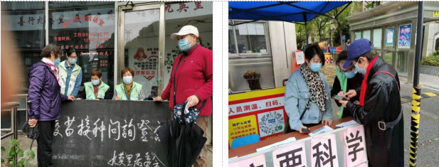 在志愿服务过程中,志愿者们进一步体会了医护人员和社区工作者抗疫的辛苦和抗疫成果的来之不易,也进一步认识到“伟大出自平凡,英雄来自人民”的深刻内涵。我们作为青年一代,这一次不再是疫情防控下的被保护者,我们也可以站在中国任何一个地点为疫情防控工作献力。有人说青年一代是永远的岁月静好与春暖花开,这是国泰民安的剪影,但在疫情之下青年人也可以拿出迎难直上的勇气与果敢,负重前行、肆意一战。 下午部分志愿者在社区工作人员的指导下开展新冠疫苗接种宣传工作,让更多的社区居民了解并认识到疫苗接种的普遍性与必要性。