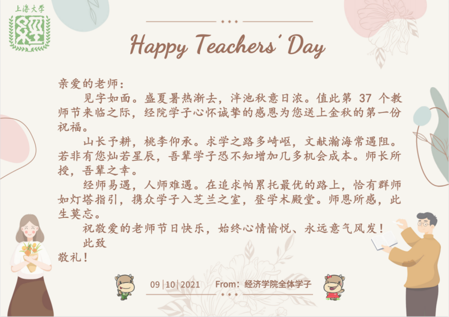 “好老师要做到学为人师、行为世范。”在第三十七个教师节来临之际,习近平总书记给全国高校黄大年式教师团队代表回信时如是说。三尺讲台,一生秉烛。在教师节这个特别的日子里,402永利集团师生通过一张卡片、一声祝福、一场座谈、一份礼物、一段视频,共同庆祝教师节,激励全院教师“赓续百年初心,担当育人使命”,努力做师德高尚、潜心育人的“大先生”! 一张卡片 一朝沐杏雨,一生念师恩。经院学子通过一张张写满真挚祝愿的卡片,表达对老师的深深祝福,浓浓的师生情跃然纸上,令人难忘。在这个感恩的节日里,学子们祝愿所有的老师健康平安,一切顺利!