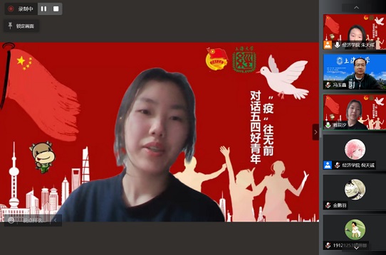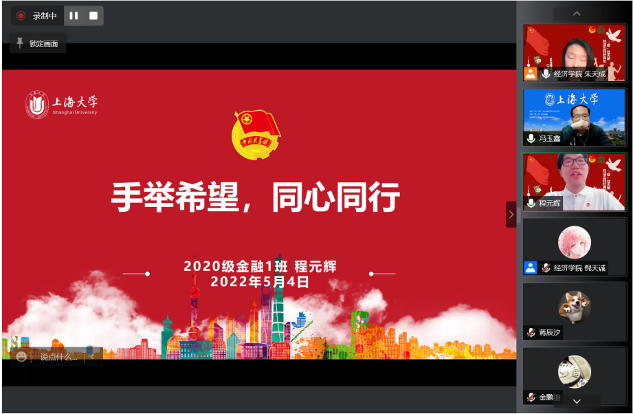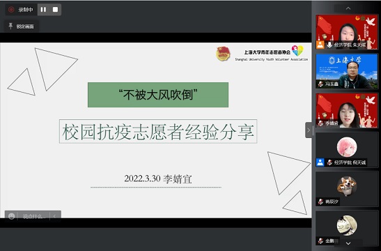 2018级金融1班、宝山五村防疫志愿者蒋辰汐同学所在的社区在居委会以及党员、志愿者的带领下,有序有效推进各项工作的开展。她认为作为青年人要敢为人先、以身作则,积极响应党和国家的号召,承担社会责任,彰显青年担当。 先锋志愿宿舍南10-908的张益娇、奚卫滢和徐冉三位同学在长达两个月的防疫过程中,第一时间积极投身志防疫工作与义工服务。她们认为积极参与志愿服务工作可以书写最美青春故事,让青春更加善良;她们相信志愿服务可以让她们去感受人间百态,去深入人群,去面对一个真实的世界;她们相信只要守望相助、共克时艰,爱与希望就会到来。 互动交流环节中,荣获2020-2021年度百优团员的辛悦、胡琳娜、金鹏羽、李佳豪四位同学发表了自己的见解。辛悦同学认为当每一位青年都尽自己所能去做力所能及的事情时,每一个岗位都会散发着伟大的光芒;胡琳娜同学提出青年人要发挥先锋模范带头作用;金鹏羽同学讲述了在她团委工作期间遇到的新的难题与解决方法,并希望能通过在建团一百周年以及五四之际举办这样一场分享会带动各位青年;李佳豪同学提倡青年人要积极参加各类志愿服务,主动承担社会责任。