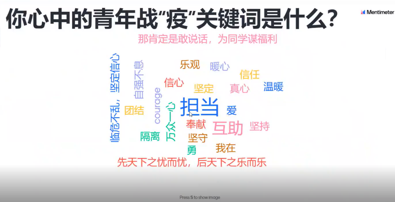 此外,参会的九十余名同学写下自己心中的青年战“疫”关键词。担当、互助、奉献、信心等词语是大家心目中战“疫”的关键所在。
