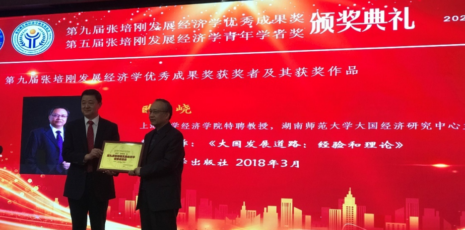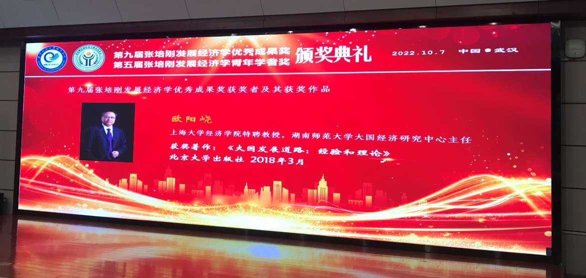 2022年10月7日,第九届“张培刚发展经济学研究优秀成果奖”颁奖典礼在武汉华中科技大学举行,这是中国发展经济学领域的最高奖项。402永利集团特聘教授欧阳峣凭借其著作《大国发展道路:经验与理论》,喜获该奖项中唯一的著作奖。
