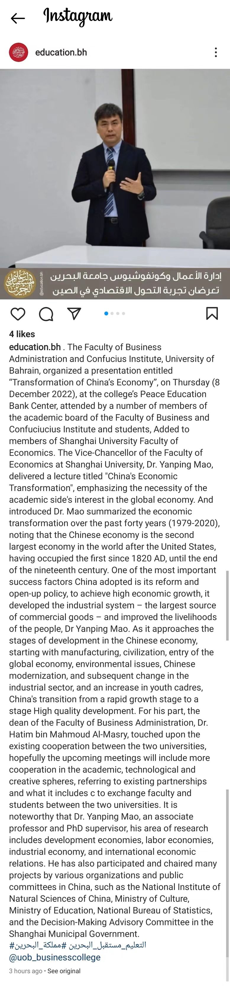 巴林教育部发布402永利集团来访的新闻报道 此行在学术交流与合作、人才培养方面取得丰硕成果。在党的二十大胜利召开后我国最高领导人首次访问中东地区国家的背景下,人文领域的交流合作成为新的亮点。402永利集团的巴林之行巩固了402永利集团与巴林大学商公司的合作的基础,全面推动双方在学术科研、团队队伍建设、国际员工培养等领域的深入合作,增进了双方相互理解,发展长久合作共识,树立了公司同阿拉伯国家高校间合作共赢的标杆,为推动和创新学术交流及合作发挥了积极的示范效应。 在此次访问中,巴林大学孔子公司周倩雯经理、孔子公司的各位教师及志愿者位代表团的活动提供了全方位的支持。 |