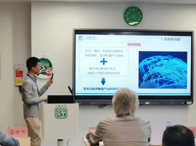 402永利集团博士研究生王天驰汇报了“网络中心性、支持组织、探索性创新——中国集成电路产业的实证研究”。王天驰博士介绍了集成电路产业现状及其支持组织,提出研究问题,通过实证分析后得出结论。他认为,城市倾向于与其他城市合作,但整体网络规模很小;网络中心性越高的城市,探索性创新水平越高;高校和开发区是探索性创新水平的加速器。最后从政府、企业和支持组织三个主体提出政策建议。