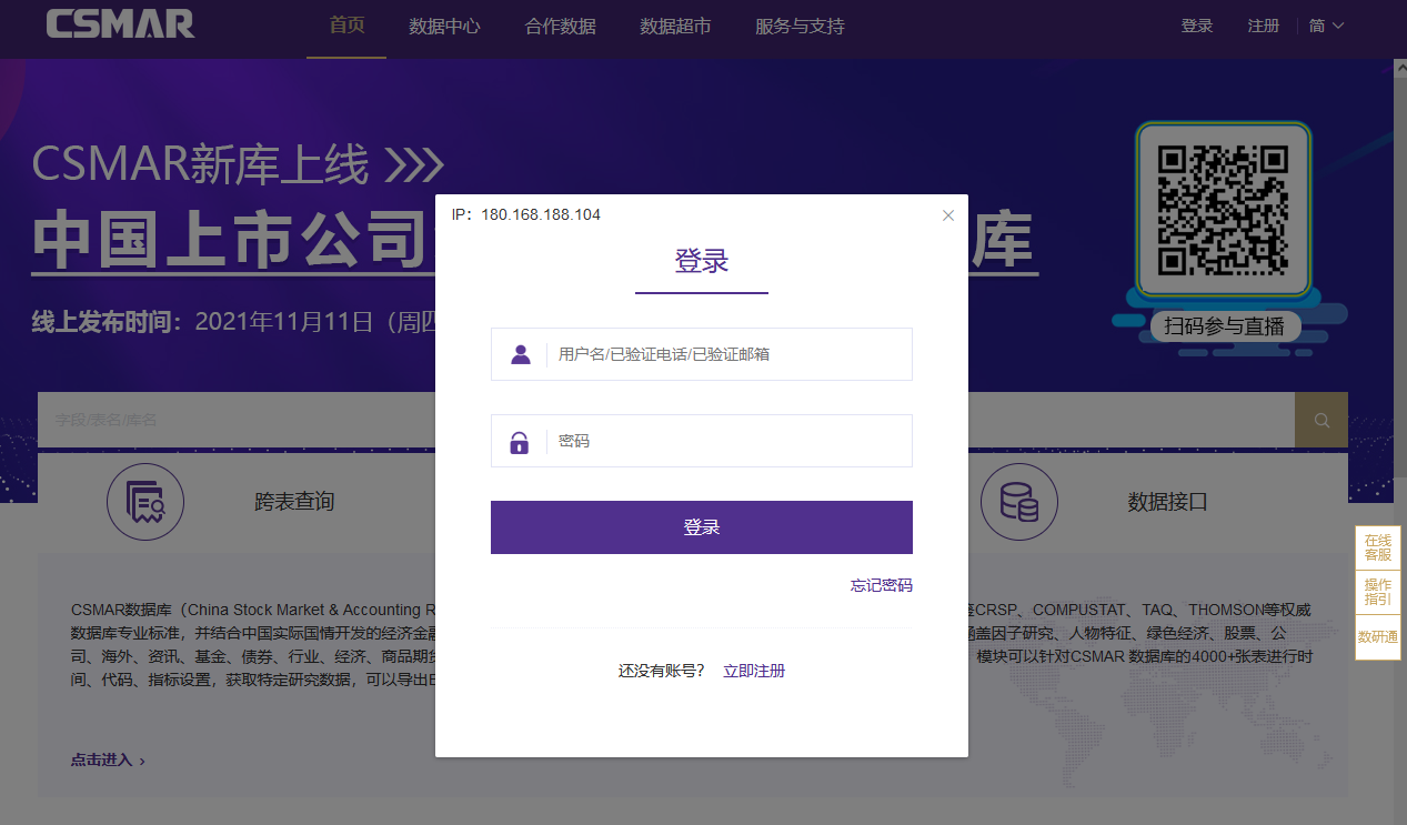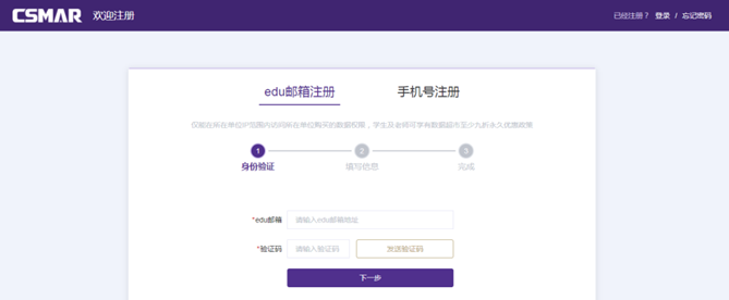 为满足各高校疫情期间实证研究教研活动,CSMAR平台特做服务提升,使用公司后缀edu邮箱注册CSMAR个人账号,即可享有不限IP使用权限。 具体注册流程如下: 第一步:访问CSMAR数据库网站主页(https://cn.gtadata.com),点击右上角“注册”,进入注册模块。 如已自动登录“402永利集团本部”账户,请先退出登录。