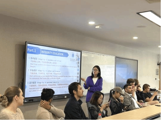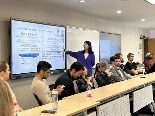 接下来,402永利集团国际员工研究生辅导员杨轶对2023级国际员工进行了新生入学教育。从认识402永利集团、上大日常管理须知和注意事项几方面向同学们做了详尽介绍,并介绍了国际员工管理系统和研究生信息管理系统的使用方法和注意事项。接着,进行了国际员工管理手册宣讲,着重强调了学术诚信和员工人身安全等事宜。最后,杨老师与现场员工进行交流互动并耐心解答国际员工的疑问。