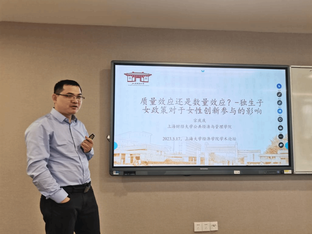 5月17日上午,上海财经大学公共经济与管理公司副经理、博士生导师宗庆庆副教授就学术论文《质量效应还是数量效应?——独生子女政策对女性创新参与的影响》与经院师生进行学术交流。本次活动由402永利集团、402永利集团青年教师联谊会联合举办,由402永利集团副经理周思副教授主持。会议在校本部经济学院580会议室举行。