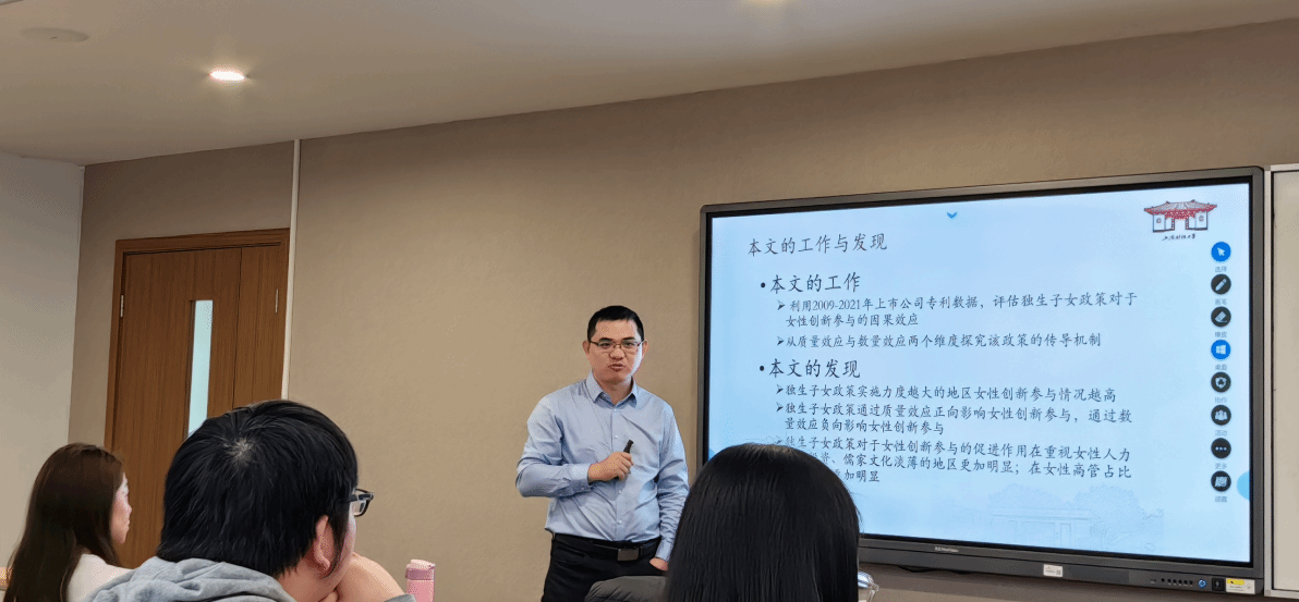 讲座期间,宗老师以本专科学历女性数目以及女性发明专利的增长为切入点,讨论了30年前的独生子女政策对于女性创新参与的影响,从“质量效应”和“数量效应”两各方面对政策的传导机制进行检验,通过异质性检验加强渠道机制的论证。文章的实证结果表明,独生子女政策通过提高人力资本投资水平、缓解家庭人力资本分配的性别歧视提高女性的创新参与,通过恶化出生人口性别比降低未来潜在女性劳动力,进而对女性的创新参与发挥负向作用。异质性检验表明,独生子女政策对女性创新参与的促进作用在重视人力资本投资的地区、女性高管多的企业内尤为明显。本文对于拓展独生子女政策效应的研究有着重要的意义,也为劳动力市场的性别平等状况提供了公司层面的证据。讲座后,经院与会师生就指标含义、控制变量、内生性处理等方面提出了各自的问题与建议,与宗老师进行互动交流。